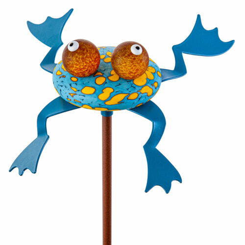Hübsche Flecken zieren den Körper dieses genauso sportlichen wie hübschen Laubfroschs, der auf einem Stab Pflanzkübel, Blumenrabatten oder die Teichbepflanzung dekoriert. Die Frösche lassen sich auf einem 75 cm langen, pulverbeschichteten, braunen Stab aus Vollmetall befestigen. Alle Metallteile sind verzinkt.