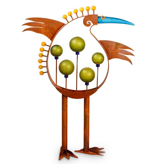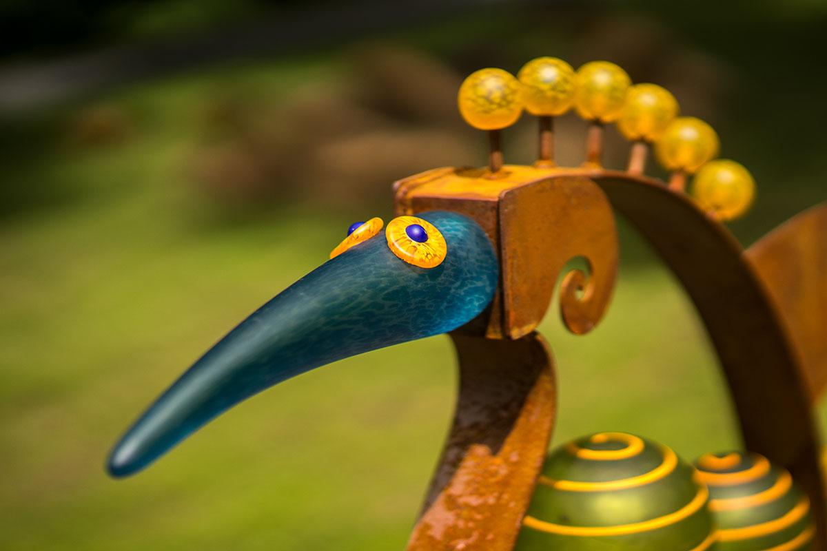 Ob er glücklich ist , ist nicht belegt aber er sieht mit seinem Sommerlich grünen Glas-Federkleid das sich von seinem Rost gefärbten Flügeln absetzt ,so aus.