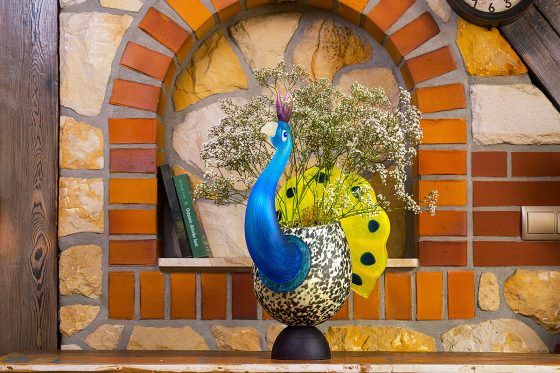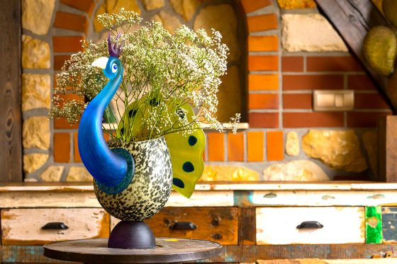 Dieser wunderschöne blaue Pfau mit seinem limonen-günen Rad aus Schwanzfedern beeindruckt nicht nur die Damenwelt! Er dekoriert die Regale und Tische in Ihrem Wohnzimmer, Küche oder Büro und bringt als Vase Ihre Lieblingsblumen zu prachtvoller Geltung. Ein Traum aus Glas aus der Borowski-Manufaktur!